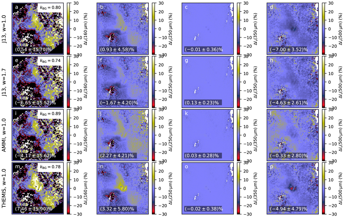 Residuals of the modelled 250–500 μm surface brightness, . The columnscorrespond to 160, 250, 350, and 500 μm, respectively. The 160 μm data were not used in the model optimisation. The rows correspond to models with different dust (J13, AMMI, and THEMIS) and LOS cloud extent (W = 1.0 or W = 1.7). The averagevalue and the standard deviation of the relative residual is quoted at the bottom of each frame.