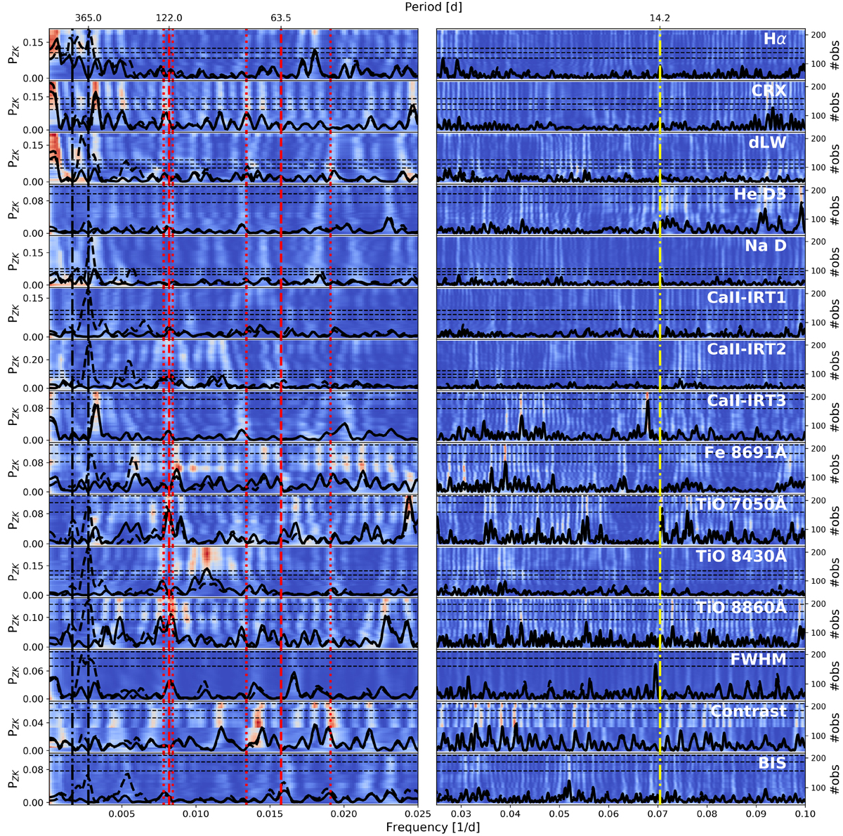 Generalized Lomb-Scargle periodograms of several activity indicators of GJ 251 from CARMENES spectroscopic data. The dashed black periodograms represent the GLS of the activity indicators, and the solid GLS periodogram represents the residuals after subtracting a 365 d signal. For the residuals from which the 365 d signal was subtracted, we also overplot the s-BGLS periodogram, where the probability increases from blue to white to red. The red dashed lines mark the rotation period and the first harmonic estimated from photometric data, while the dotted red lines show the 3σ uncertainties. The dashed black line marks a significant HIRES signal around 600 d, and the yearly period of 365 d. The dashed yellow line marks the period of the planetary signal published in this work.