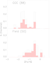 Fig. A.1. Top: metallicity distribution of cluster TIICs. The source catalogue is on the database by Clement et al. (2001). The iron abundances are based on the metallicity scale by Carretta et al. (2009). Bottom: same as the top panel, but for Galactic field TIICs. The iron abundances are based on high- and low-resolution spectra The red histogram displays the metallicity distribution of WVs only (see text for details). |