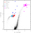 Fig. 1. B − I,V Optical Colour-Magnitude Diagram of the Galactic globular ω Centauri (Braga et al. 2016). Black dots indicate cluster stars, selected according to radial distance and photometric error. The cyan circles and red squares indicate candidate cluster first overtone (101 RRc, −0.6 ≤ log P ≤ −0.3) and fundamental (85 RRab, −0.33 ≤ log P ≤ 0.0) RRLs, respectively (Braga et al. 2016). The blue diamonds denote TIICs (7, 0.05 ≤ log P ≤ 1.5), based on mean magnitudes derived in Braga et al. (2020). The magenta asterisks show a selection of cluster LPVs (1.58 ≤ log P ≤ 2.72) identified by Lebzelter & Wood (2016), but based on our own photometry. |