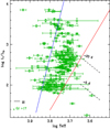 Fig. 4. Hertzsprung-Russell diagram comparing the predicted edges of the instability strip and observations for Magellanic TIICs (blue and red solid lines) by Groenewegen & Jurkovic (2017a,b). The horizontal error bars display the uncertainty in effective temperature. The black dashed lines are the iso-periodic lines for 5 and 20 days. |