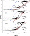 We decided to follow a simple approach: For each of the three initial chemical compositions of Fig. 5, we computed synthetic HB models employing the same tracks as in the figure, assuming at first a uniform mass distribution from the extreme HB to the red HB (the values of Y, Z, and mass ranges are given in the figure caption). Briefly, the synthetic HBs were calculated as follows. For a given (Z, Y) pair (the He abundance is kept constant at fixed Z), we first select randomly (uniform probability) a value of the HB mass ms in the appropriate mass range, and the corresponding HB track is determined by interpolation in mass among the available set of HB tracks at that metallicity.