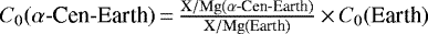 , where C0 represents the mantle concentration of an individual radionuclide upon the planet formation; X/Mg (α-Cen-Earth) refers to Col. 2 in panel 2 of this table (40K is excluded from this calculation); X/Mg (Earth) refers to Table A.1 (for normalisation purposes, the Mg concentration was kept unchanged over geological time). (f) See text. Ct = C0 × e−t ln 2∕T1∕2, where t represents the system age (the current age of α Cen AB is 6 ± 1 Ga as of M18); T1∕2 are the half-lives of these radionuclides (232Th – 14.0 Ga; 235U – 0.704 Ga; 238U – 4.47 Ga; 40K – 1.25 Ga; Turcotte & Schubert 2002). (g)See text. Concentration of 40K upon planet formation,