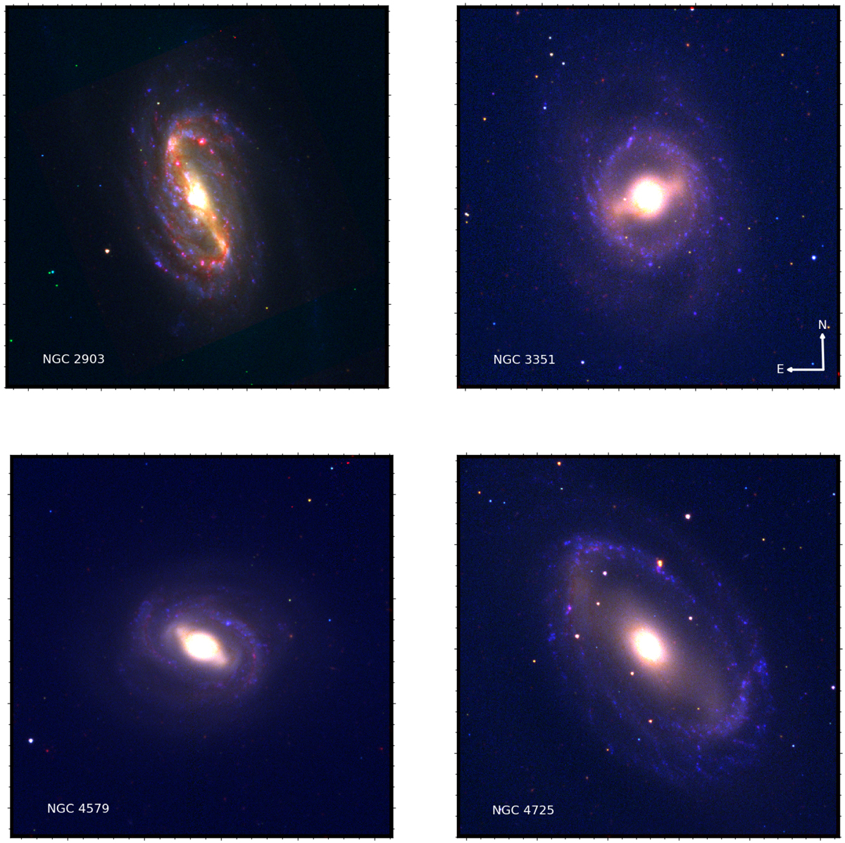 Colour-composite images of the barred galaxies NGC 2903, NGC 3351, NGC 4579, and NGC 4725. The RGB images are created by assigning red (Spitzer 3.6 μ), green (SDSS r band) and blue (SDSS u band) colours to the images. All images have the same orientation; the north-east direction arrows are laid on the image of NGC 3351.