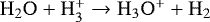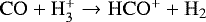 | HCO+ + H2O → CO + H3O+ | 2.5(−9) | − 0.5 | 0 | 4.3(−9) | 3.5(−9) | cm3 s-1 | (e) | ✓ | ||