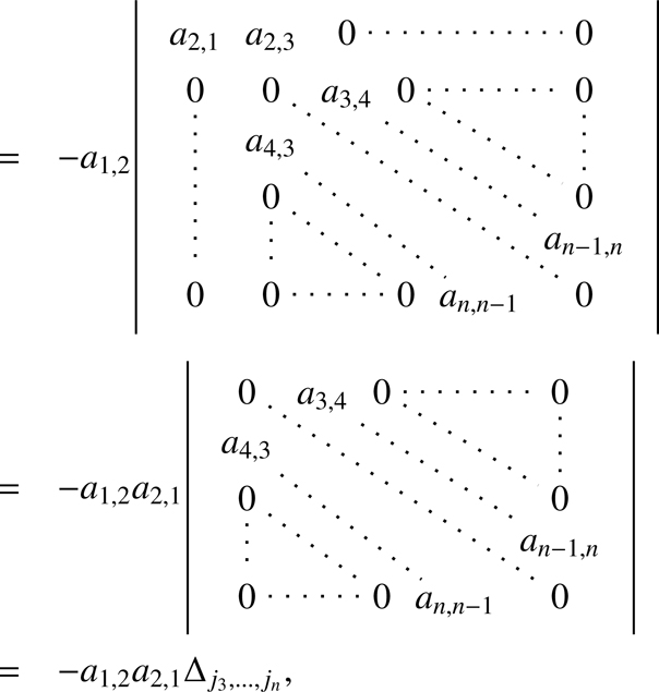 where we expanded along the first row to find the second equality and along the first column to find the third equality. Clearly, we can omit terms that are 0 from the sum in the right-hand side of Eq. (B.11). Now, the factors a1, 2 and a2, 1 are different from 0 only if j2 = j1 + 1, in which case