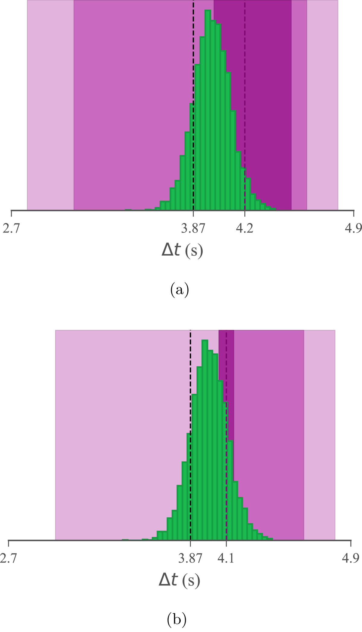 Marginal distribution of Δt from the nazgul fit (green) compared with the 1, 2 and 3σ confidence intervals (purple) from the cIPN method for two different resolutions. The coarse resolution used for the nazgul fit (panel a) and a finer 50 ms resolution (panel b). The true value is shown as a black line and the mean value from the cIPN as a purple line.