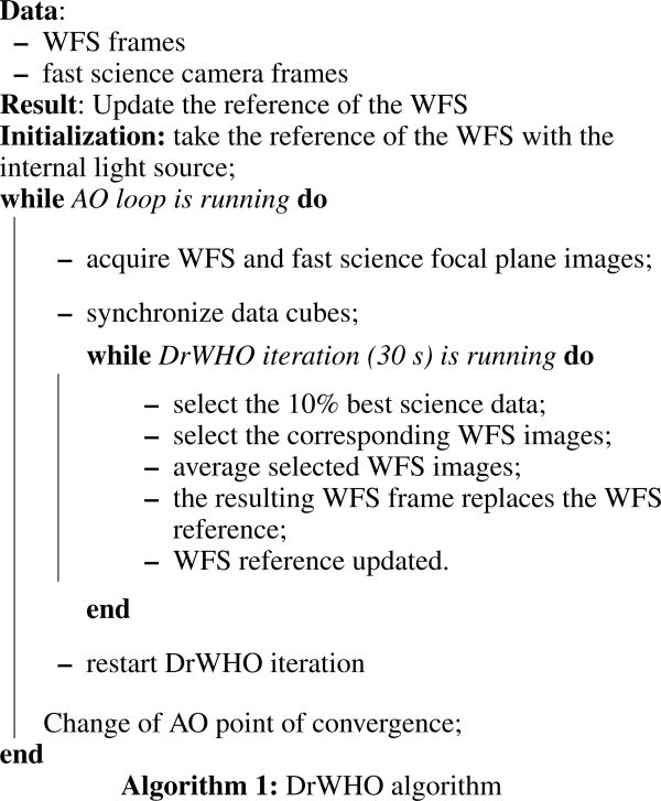 It is flexible in terms of the parameters, whether it is the score (Strehl, contrast, intensity, etc.), or the selection fraction and the time of the iteration, making it adaptable to different weather conditions and AO systems with different characteristics and scientific goals. However, DrWHO needs a fast focal plane camera as close as possible to the science camera, to more accurately compensate the NCPAs and low aberrations.