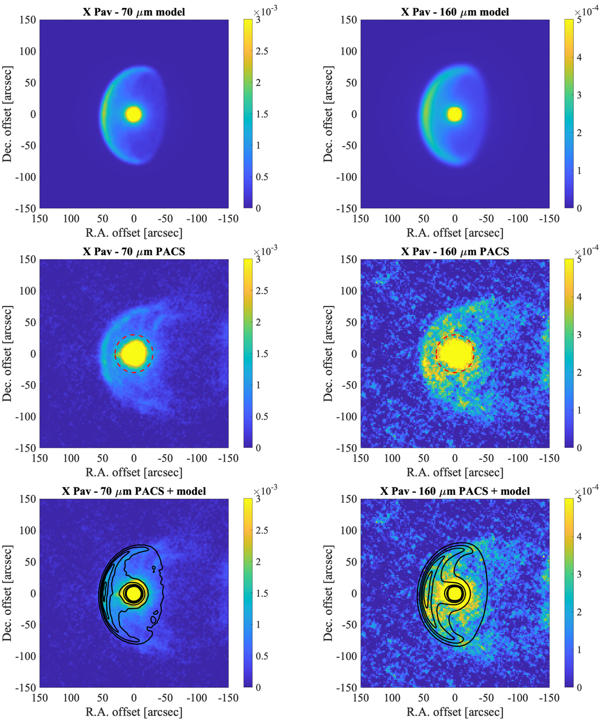 Observations and models for X Pav: Top to bottom: The Radmc3D model, the PACS image, and the PACS image with contours from the model. Images are for 70µm (left) and 160µm (right). Maximum contour levels are 2.2×10–3 Jy/″2(70µm) and 0.34×10–3 Jy/″2(160µm), respectively. Minimum contour levels are 10% of maximum. The colour scale is in Jy/″2. The red dashed circle shows the mask used to measure the flux from the star and present-day mass-loss.