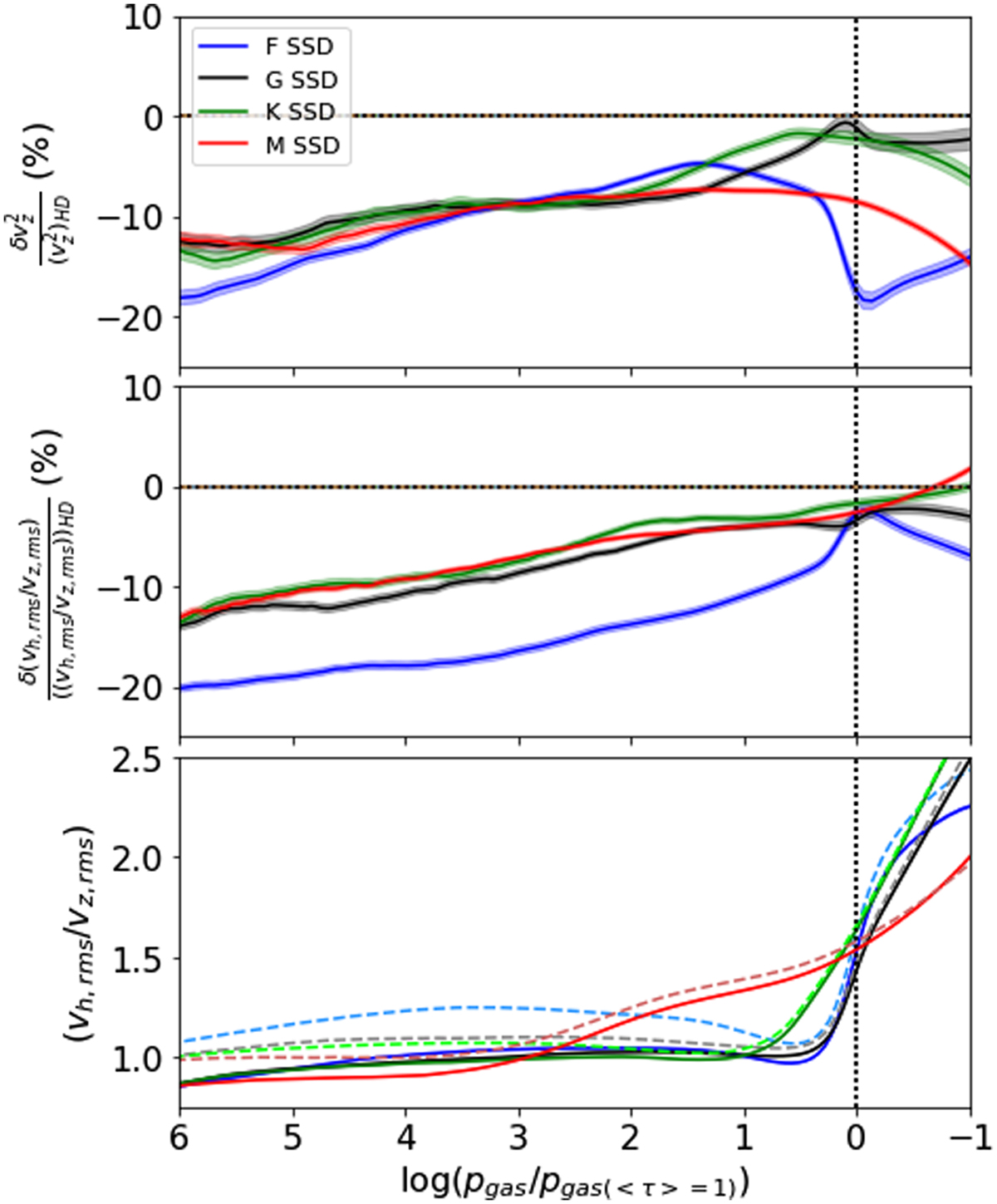 Relative decrease in convective velocities (top), relative decrease in ratio of horizontal to vertical rms velocities vh,rms/vz,rms (middle) and the actual vh,rms/vz,rms ratio (bottom).