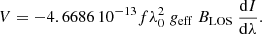 In the weak-field regime, when the Zeeman splitting of a spectral line is much smaller than its Doppler width, a perturbative scheme to the polarized radiative transfer equation can be applied, and assuming a constant magnetic field the following relationship between the circular polarization signal, V, and the strength of the LOS magnetic field, BLOS, can be derived (del Toro Iniesta 2003):