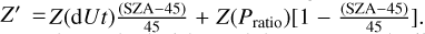 ), respectively. Although Pd_sw and Pth_ion are almost negligible near the MPB (especially at the subsolar region), taking them into account allowed us to determine the location of the MPB more accurately. (2) In the region of SZA ≥ 90°, the MPB locations are defined by the extreme value of the flow speed gradient when r < (rBS_model − 0.1). Here, rBS_model is the corresponding radial distance of the bow shock from the Mars center, calculated by the Martian bow shock model of Wang et al. (2020a). Therefore, the extreme value of the flow speed gradient corresponding to the bow shock location is excluded. (3) For SZA ∈ (45°, 90°), we employed these two methods to find the two locations of the MPB, which refer to Pratio and dUt, and the MPB locations (X′, Y′, Z′) were calculated according to the relations as follows: ![$X' = X\left( {{\rm{d}}Ut} \right){{\left( {{\rm{SZA}} - {\rm{45}}} \right)} \over {45}} + X\left( {{P_{{\rm{ratio}}}}} \right)\left[ {1 - {{\left( {{\rm{SZA}} - 45} \right)} \over {45}}} \right],\,\,Y' = Y\left( {{\rm{d}}Ut} \right){{\left( {{\rm{SZA}} - 45} \right)} \over {45}} + \,\,Y\left( {{P_{{\rm{ratio}}}}} \right)\left[ {1 - {{\left( {{\rm{SZA}} - 45} \right)} \over {45}}} \right],\,\,Z'\, = Z\left( {{\rm{d}}Ut} \right){{\left( {{\rm{SZA}} - 45} \right)} \over {45}} + Z\left( {{P_{{\rm{ratio}}}}} \right)\left[ {1 - {{\left( {{\rm{SZA}} - 45} \right)} \over {45}}} \right]$](/articles/aa/full_html/2022/08/aa42885-21/aa42885-21-eq9.png)