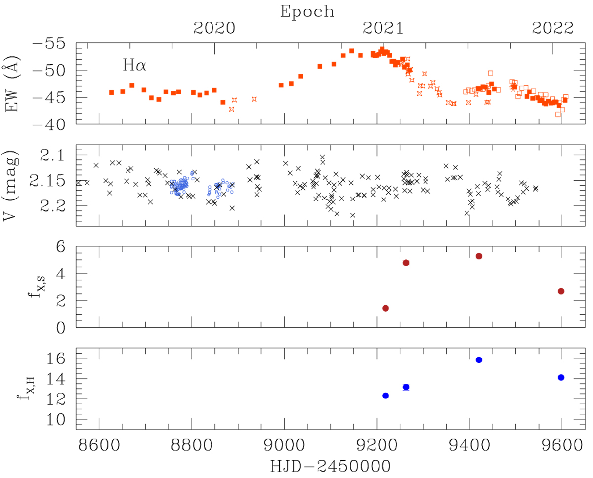Variations in EW(Hα) (top panel), in the APT and AAVSO V-band photometry (second panel), and in the soft (third panel) and hard X-ray fluxes (bottom panel) of γ Cas during the 2021 disc eruption. In the second panel, APT differential magnitudes from Smith & Henry (2021) were shifted by 6.49 mag and are shown as blue circles, and AAVSO photometry by observer Wolfgang Vollmann is shown as black crosses. The X-ray fluxes are in units of 10−11 erg cm−2 s−1.