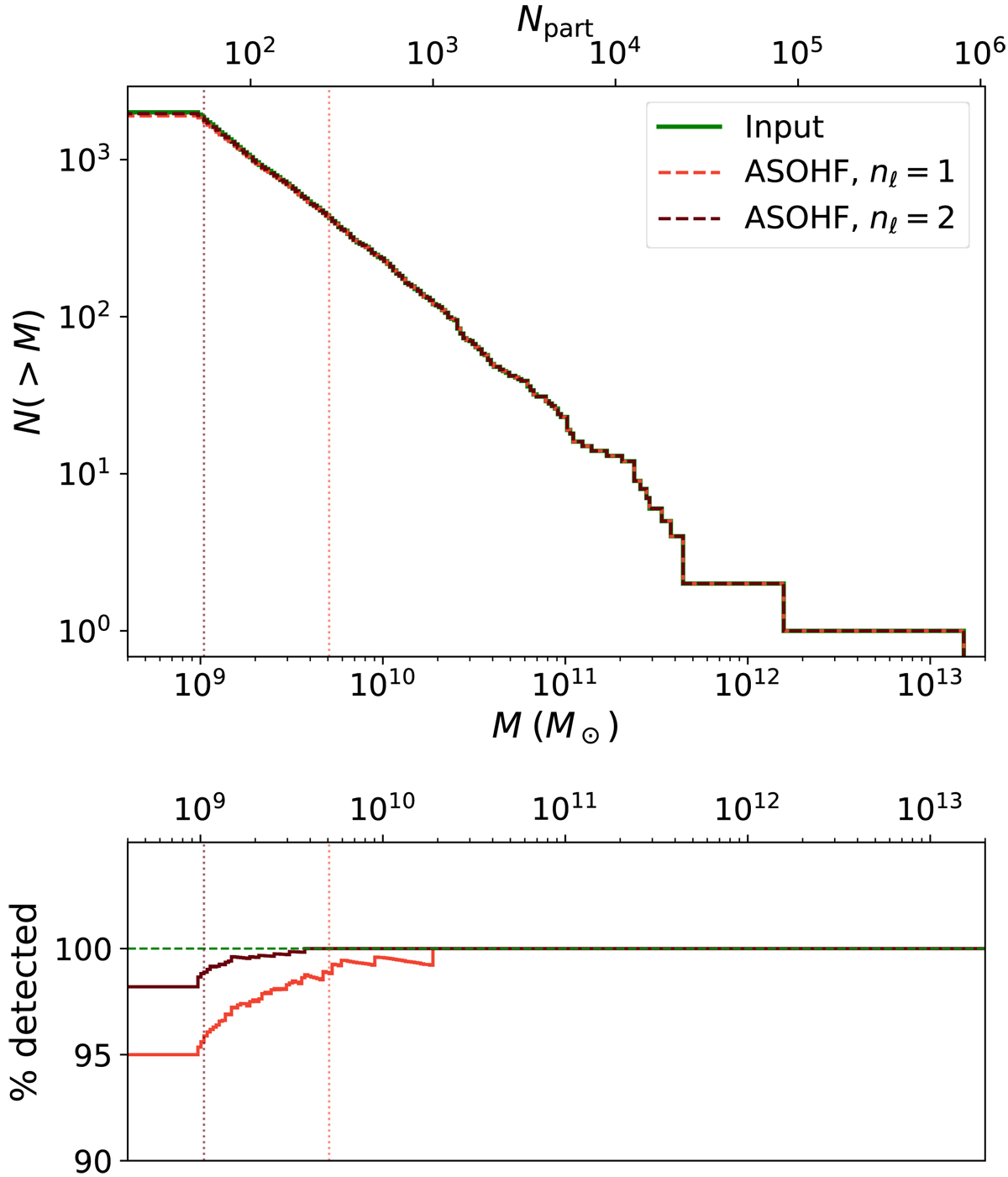 Results from Test 2. Upper panel: input substructure cumulative mass function (green line) compared to ASOHF results with nℓ = 1 (red) and nℓ = 2 (dark red). The vertical lines mark the completeness limit, this time at 99%, of the catalogue produced by ASOHF. Bottom panel: fraction of substructures with input mass higher than M detected by ASOHF, with the same colour codes as above.
