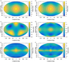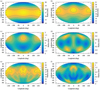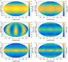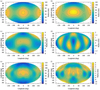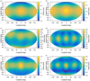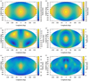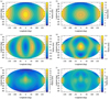 Maps A.1 to A.10 (a) describe degrees 0 to 2. Assuming that the satellites form along a Roche ellipsoid and that the low degrees have been slightly modified during the migration of satellites, it should be possible to recover their original shape. To do this, we used the first-order relations between the semi-major axis of the ellipsoid (a1, b1, c1) and the low degrees (cf. Balmino 1994) to extract the semi-major axis ratio of the ellipsoid (b1/a1, c1/a1):