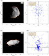 Fig. 1 Limb measurements for Atlas (Ia) and Prometheus (IIa). The background is an image coming from ISS (N1560303820 for Atlas and N1640506063 for Prometheus) and the yellow points represent the observed limb deduced from Caviar software and the red points are the shape model deduced from the SH analysis. The left panels (Ib) and (IIb) represent the residues between the observed limb and shape model expressed in kilometers. In the label, we note the root mean square (rms), the standard deviation σ and the scaling factor R. |