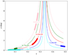 Fig. 9 Amplitude of librations A as function of triaxility γ for the eccentricities corresponding to small satellites: Atlas (cyan), Epimetheus (pink), Janus (green), Pandora (red), Prometheus (blue). The eccentricity values are indicated in the figure. |