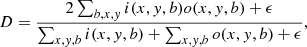 where i(x,y,b) and o(x,y,b) are the values of the output and target images for all pixels (x and y coordinates) and elements of the minibatch (b coordinate), while ϵ is a small quantity (0.001 in our case) that prevents the Dice coefficient from being undefined. To use the Dice coefficient as an efficient loss function for the training of a model, the simplest way is subtracting it from the unit, computing the Dice loss, given by: