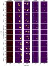 Fig. 3. Comparison of an output sequence, centered on December 12, 2013, for each method. The first column shows the square root of the STEREO data used to compute the activity masks. The second column shows the activity masks. Third to fifth columns show outputs from FarNet-II, FarNet, and the phase-sensitive method, respectively, for the region corresponding to the EUV masks on the second column. In Cols. 2–5, the color gradient goes from purple for zero or values near zero to yellow for values near one or one. Outputs from FarNet are only valid on the central range of 120 degrees of longitude (vertical blue lines). Seismic strength and integrated probability were not taken into account to select the regions on the outputs from FarNet and the phase-sensitive method. Every region that passed the post-processing was included. |