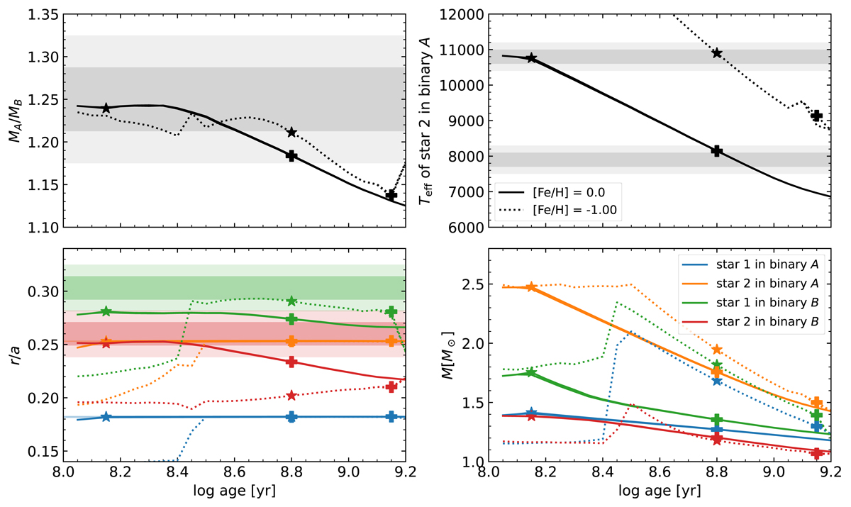 Constraints on physical properties of stars in CzeV343 using MIST isochrones. We show three observables that we are trying to simultaneously fit: mass ratio of the two binaries constrained by LTTE (top left), effective temperature of star 2 in binary A (top right), and the four relative radii of individual components from our photometric model (bottom left). In these three panels, lighter and darker bands show 1 and 2σ confidence intervals of the constrained parameters. In the top right diagram, we show two gray bands corresponding to two choices of Teff, prior. Bottom right panel: best-fit initial stellar masses. In all panels, lines show best-fit models as a function of isochrone age for two metallicities as explained in the legend. The best-fit model for each metallicity is marked separately for Teff, prior = 7900 K (plus sign) and Teff, prior = 10 800 K (star).