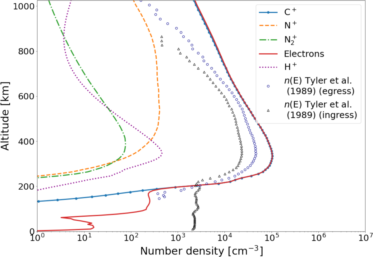 Number densities of the main ions in Triton’s atmosphere. The black triangles and dark blue circles represent the electronic profiles measured by Voyager 2 at the two occultations points (Tyler et al. 1989).