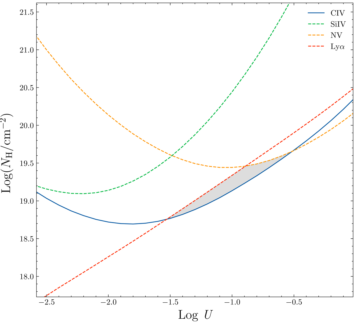 Theoretical values of U and computed NH assuming the Nion lower limit for CIV (solid blue curve), and upper limits for NV (orange-dashed curve), SiIV (green-dashed curve), and Lyα (red-dashed curve) ions for the A component of the UFO BAL in the SDSS 2012 spectrum of J1548+0855.