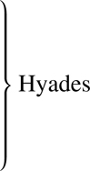 | HD 23325 | Pleiades | 100.0c | 7654.0 | 4.24 | −0.44 | 0.31 | 4, 7 | |