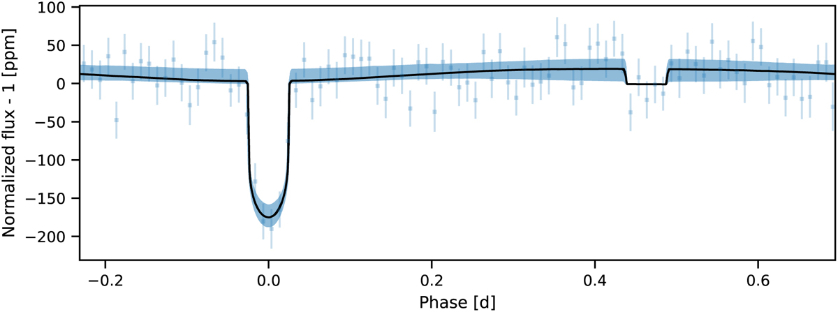 TESS observations from sectors 42 and 43 folded over the orbital phase (in days) and binned (for visualization) with the median posterior phase-curve model (black line) and its 16th and 84th percentile limits (blue shading). The eclipse is modeled assuming a uniform stellar disk with a depth scaled from 0 (eclipse) to 1 (out of eclipse).