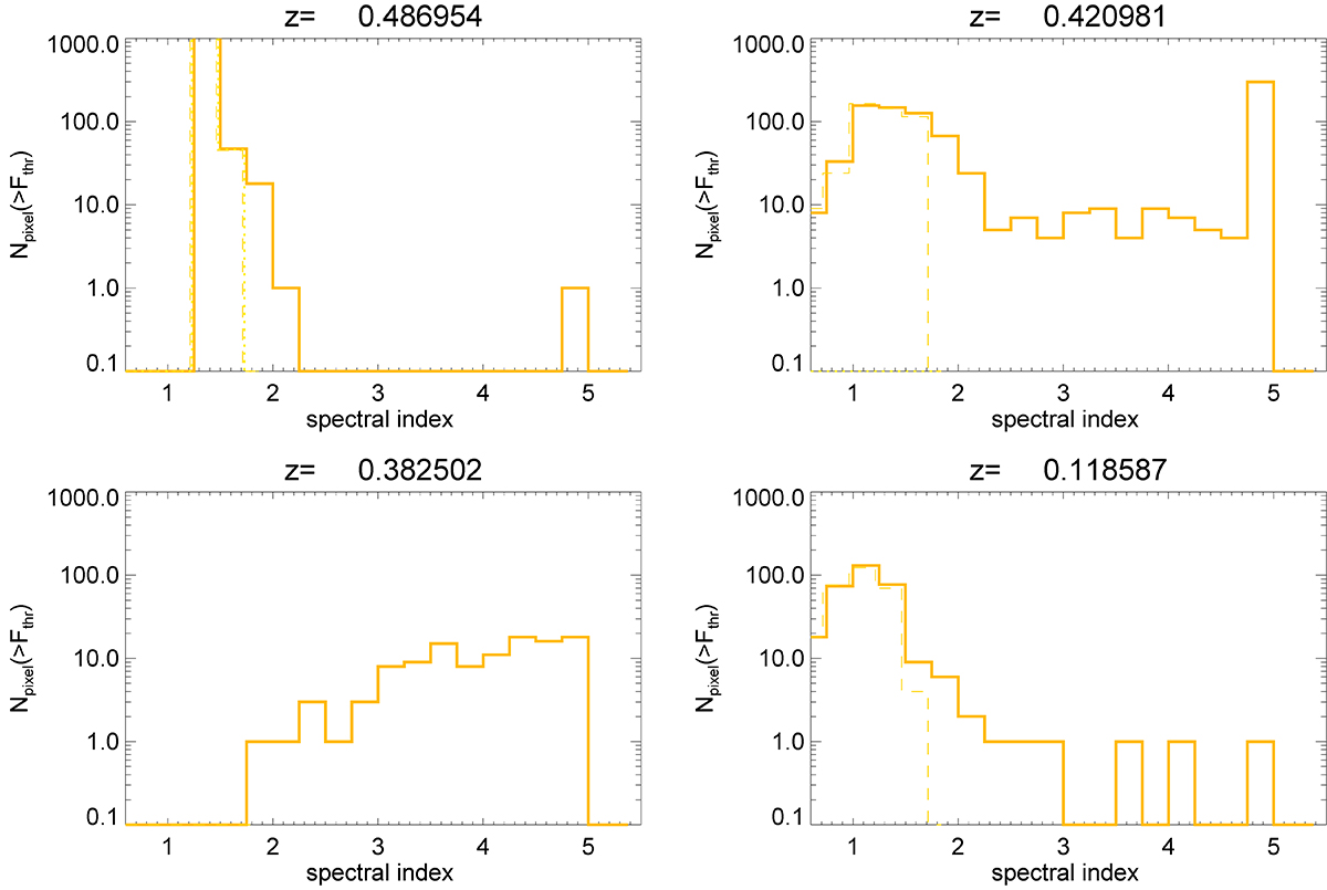Distributions of radio spectral index between 140 and 50 MHz, only for ≥1σrms detectable pixels in radio maps of the run E at four different epochs. The solid lines give the distribution of distribution of spectra for the electron evolution model including shocks and turbulent re-acceleration, the dashed lines are for the electron model only including shock re-acceleration and loss terms, and the dotted lines are for the electron model only including radiative losses and adiabatic changes after the injection by jets.