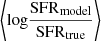 Modes and 68% percentiles for the logarithm of the ratio between the estimated SFR for the model SEDs using Eq. (4), based on WISE band-1 and band-3 or NIR-F200W and MIRI-F2100W, over the true SFR as given by the SFHs of the SED modeling.