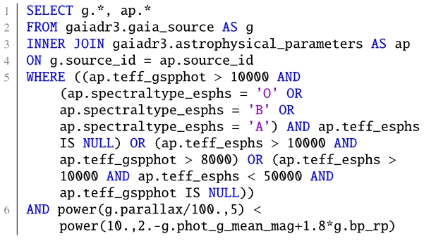 Subsequent cross-matches to the tables containing the CBJ2021 distances and the astrometric fidelity flag were made after saving the results of this query as a user table. The final selection on |Z|< 300 pc and |Z|< 1 kpc for the OB sample and the RGB samples, respectively, was made during the creation of the maps in Section 4 and 5.