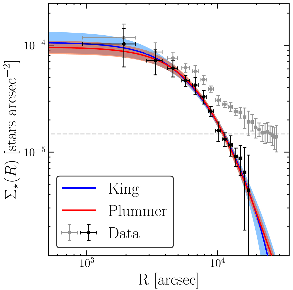 Stellar number density profile of an 8° region around the system’s center of mass and considering stars brighter than G = 18 mag. The observed profile is shown in gray, while the intrinsic profile (after background subtraction) is shown in black. The Plummer model (in red) and the King model (in blue) are also shown, along with the corresponding 68% credible regions constructed from the posterior samples.