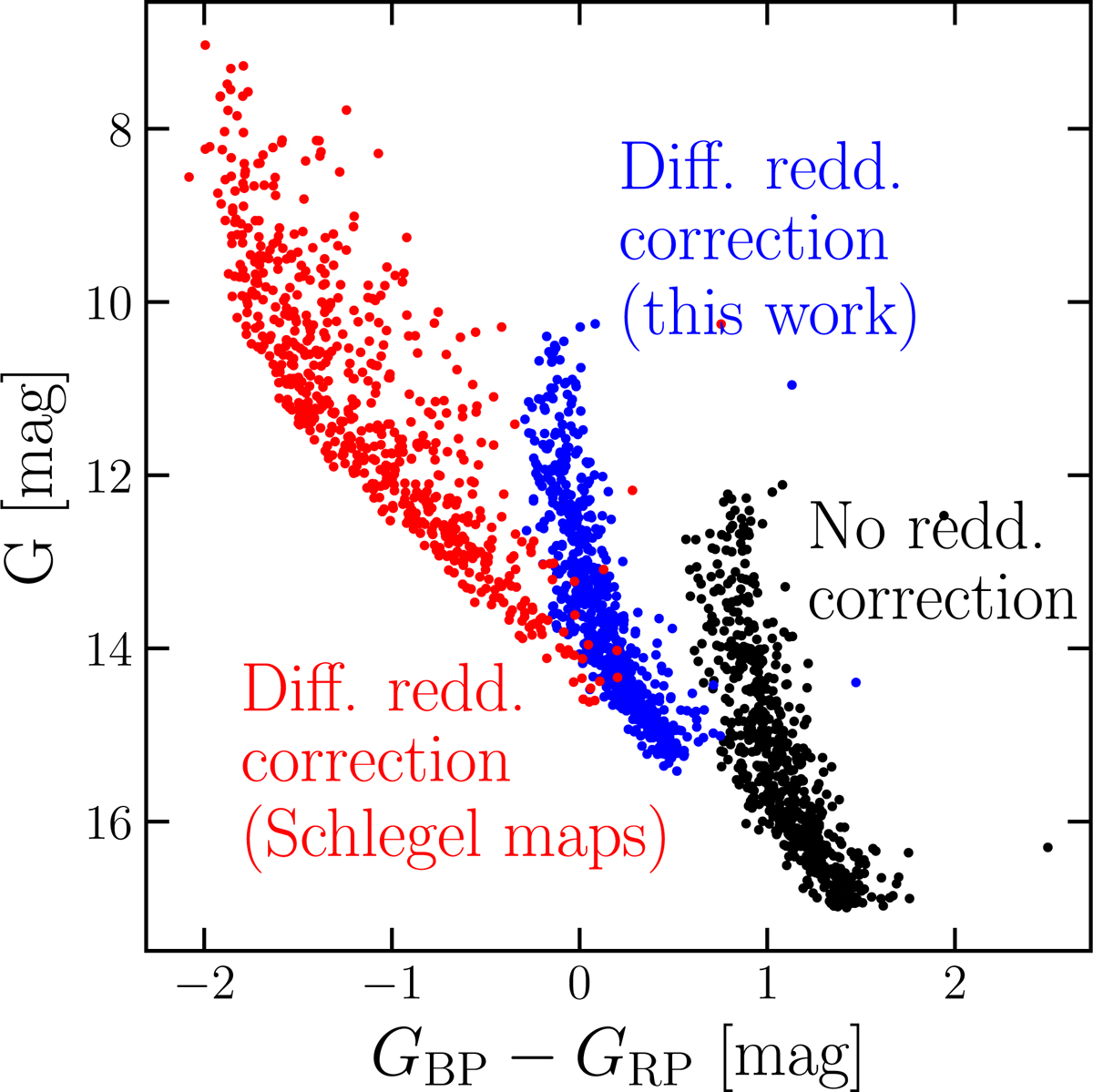 Color-magnitude diagram for NGC 663 members. In black the observed photometry, while in red and blue are shown the distributions of stars after correcting for differential reddening. For the former Galactic extinction maps by Schlegel et al. (1998), Schlafly & Finkbeiner (2011) are used, and for the latter the reddening corrections estimated in this work.