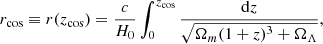 To convert distances to cosmological redshifts zcos we numerically invert the redshift-comoving distance relation, which for a flat ΛCDM universe is given by