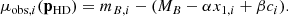 To generate the light-curves, we used the SALT2.4 model (Guy et al. 2007, 2010), which parameterized them by their stretch x1, color c and peak-magnitude in the Bessel-B band mB. Using the Tripp relation (Tripp 1998), the rest-frame magnitude in Bessel-B band for a given SN (indexed by the subscript i) is