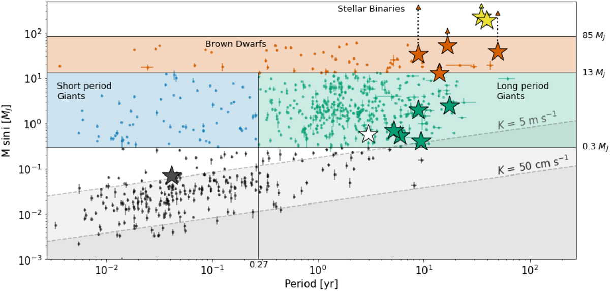 Overview of the discovered companions, including the uncertain planetary signal HD 3964 b (white star). Star markers indicate companions discussed in this paper, and colours differentiate between short-period (black) and long-period giants (green), brown dwarfs (orange), and stellar binaries (yellow). Arrows indicate the true masses as found by orvara. Round markers are previously detected (using the RV method) exoplanets and brown dwarfs with well-constrained (>3σ) masses and periods from the exoplanet.eu archive. The grey shaded regions indicate the RV precision detection limits 50 cm s−1 and 5 m s−1 for 1 M⊙. The giant planets (0.3 MJ < M < 13 MJ) are highlighted where the difference between the short-period (blue-shaded) and long-period (green-shaded) objects is defined at 100 days. The brown dwarf region is shaded orange.