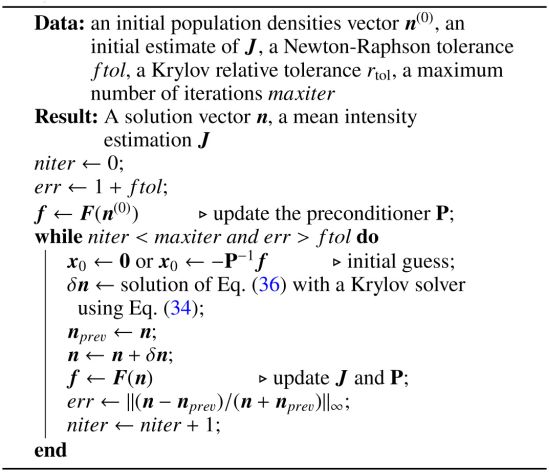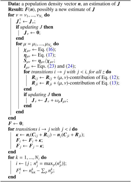 for mass conservation equations. Altogether, Eqs. (21)–(22) form a residual vector F(n) with the same dimension as n. Solving the system of equations for the vector of population densities n is therefore equivalent to finding the root of the residual vector F. The calculation of F for a given atmosphere and population densities is detailed in algorithm 1. The residual vector is the central part of the solving process and constitutes the main computational cost of it. Thus, we evaluated the performance of a solver by the number of computation calculations of F (hereafter calls) needed to solve the problem to a given precision.