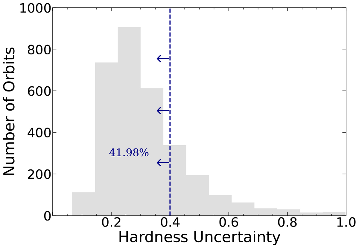 Histogram of hardness uncertainties derived from fluxes outside the eclipse region, as defined in Sect. 3.1. The threshold, indicated by a vertical line refines the sample by excluding hardness values with uncertainties exceeding 0.4. See further details in Sect. 4.1.
