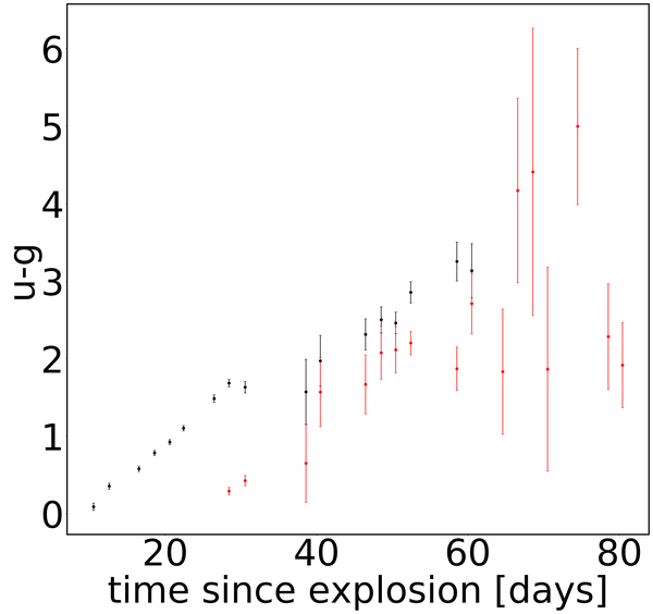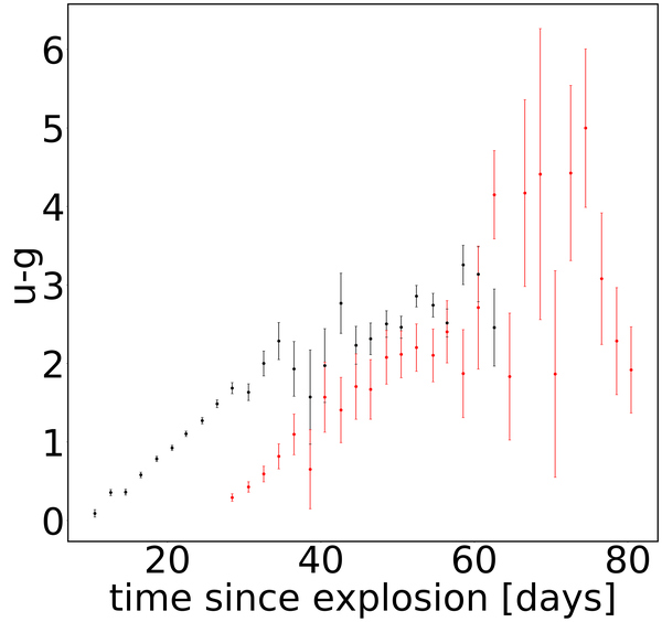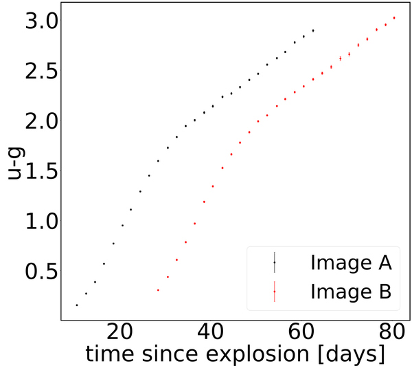 Notes. The top two rows state the color curve scenario and the considered numbers of noise realizations. The third row shows one sample color curve for each scenario, including images A in black and B in red.