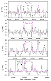 Fig. 1. Lines of CH3CHS observed in TMC-1 (black histogram). The negative features correspond to artifacts caused by the frequency-switching technique. The line parameters are given in Table 1. In magenta we show the LTE calculated line profiles adopting a column density of 9.8 × 1010 cm−2, a rotational temperature of 9.0 K, a full width at half maximum of 0.76 km s−1 (the average of the values observed for the seven detected components; see Table 1), and a circular emission distribution with a diameter of 80″. |