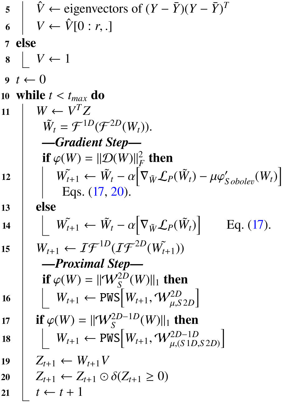 Convergence took between 30k and 100k iterations, depending on the toy model. On average, one iteration of the algorithm took around 3 s with the method with 2D-1D wavelet regularization, resulting in a computation time of between 25 h and 83 h. With the low-rank approximation with Sobolev, each iteration took around 2 s, resulting in a computation time of between 15 h and 55 h; the low rank with wavelet 2D was around the same.