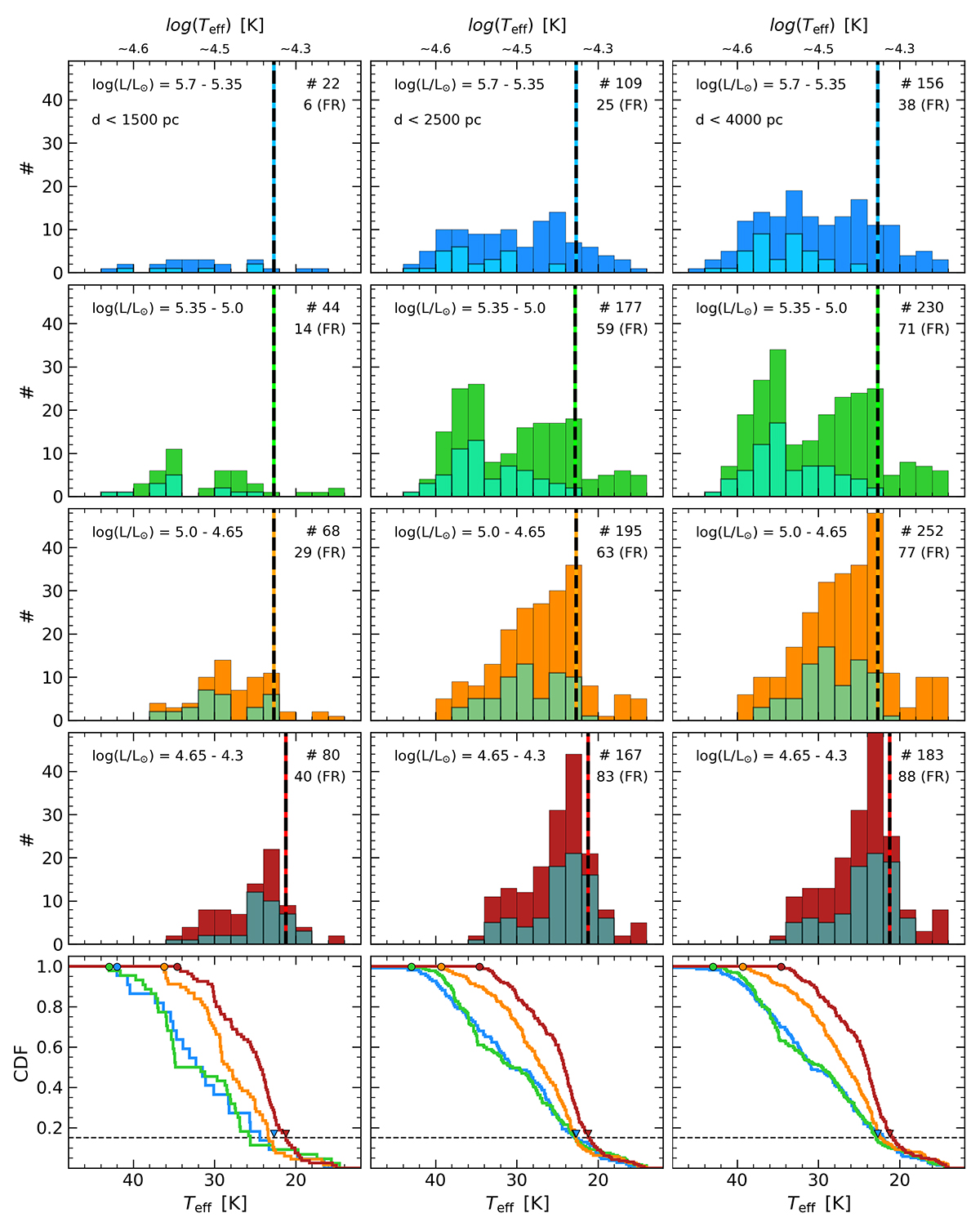 Number of stars with respect to their effective temperature. The histograms in the top four rows of subpanels separate stars within the indicated range of luminosities using different colors. Cyan bins indicate fast-rotating stars with v sin i > 100 km s−1. Each histogram displays the total number of stars and of fast-rotating objects (FR). Each column separate stars by their distances, as indicated in the top panel. The adopted position of the TAMS for each luminosity range is included with a vertical dashed line (see Sect. 4.1). The bottom row of subpanels displays the corresponding cumulative distribution function following the color code of the histograms.