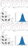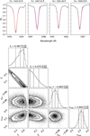 Fig. D.1 Same as Fig. 1 but for the UVES spectrum. Top. Best fit synthetic spectra (red) to the observations (black) including the non-magnetic synthetic spectra (dashed-blue). Right. Corner plot showing the posterior distributions of the MCMC parameters. |