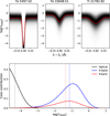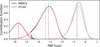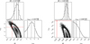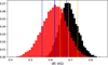 Fig. 6 Comparison of the contribution functions for the Fe i 5434.52 Å line determined using ATLAS 12 (red lines) and MARCS (black lines) model atmospheres. The solid lines represent the line core, dashed and dotted lines represent distances from the core of 0.05 and 0.25 A respectively. Vertical lines correspond to centre of gravity for each contribution function. Note that the contribution functions for the MARCS model spectrum are cut off at the top of the MARCS model. |