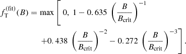 ![$$ \begin{aligned}&f_{\rm T}^\mathrm{(fit)}(B) = \max \left[ \ 0,\ 1 - 0.635\ \left( \frac{B}{B_{\rm crit}} \right)^{-1} \right. \nonumber \\&\qquad \qquad \qquad \left. + 0.438\ \left( \frac{B}{B_{\rm crit}} \right)^{-2} - 0.272\ \left( \frac{B}{B_{\rm crit}} \right)^{-3} \right]. \end{aligned} $$](/articles/aa/full_html/2025/04/aa53888-25/aa53888-25-eq19.gif)