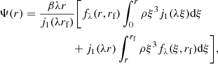 ![$$ \begin{aligned}&\Psi (r) = \frac{\beta \lambda r}{j_1(\lambda r_{\rm f})} {\Bigg [} f_\lambda (r,r_{\rm f}) \int _0^r \rho \xi ^3 j_1(\lambda \xi ) \mathrm{d}\xi \nonumber \\&\qquad \qquad \qquad \qquad + j_1(\lambda r) \int _r^{r_{\rm f}} \rho \xi ^3 f_\lambda (\xi ,r_{\rm f}) \mathrm{d}\xi {\Bigg ]}, \end{aligned} $$](/articles/aa/full_html/2025/04/aa53888-25/aa53888-25-eq2.gif)