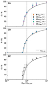 Fig. 3. Trapped fraction as a function of the central field strength of the internal magnetic field for the models 2A (top), 2B (middle), and 2C (bottom). Different colors indicate different combinations of the frequency ω and the spherical degree l (see legend). The dotted lines mark the corresponding central critical field strength. The error bars are determined by the uncertainty of fT (see Eq. (12)). The line connecting the symbols is a fit to the trapped fraction presented in Sect. 3.2. |