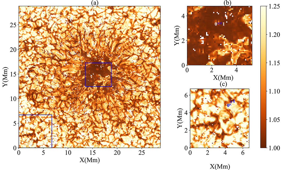 Panel (a): Normalized peak intensity of Mg I 12.32 μm line calculated by RH 1.5D for MURaM model. Panel (b): Sunspot umbra. Panel (c): Quiet Sun. The blue crosses in panels b and c mark the pixels used for the analysis in Section 3. Note that the white sprinkles indicate points where the radiative transfer calculation fails to converge or crashes.