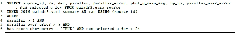 To extract the Gaia objects, we selected all sources within 1 kpc to mostly avoid Galactic extinction and reddening. We also required reliable parallax measurements (parallax_over_error > 5) and the availability of Gaia light curves (has_epoch_photometry=’True’), with at least 25 observations in the Gaia G band (num_selected_g_fov > 24), which we considered as the minimum necessary to detect photometric variability (Ranaivomanana et al. 2025; Morales-Rueda et al. 2006). These requirements were implemented in the Gaia astronomical data query language (ADQL) query form1 when we ran the data extraction (see the appendix for the full ADQL query). The query resulted in 2 080 613 objects, where distances in parsecs (pc) were estimated by a simple 1/parallax estimation to compute the absolute G magnitudes, MG. Using a more sophisticated method for distance determination (Bailer-Jones 2015) yielded very small differences due to the (pre-selected) high-quality parallax measurements. In the diagram, our initial sample was drawn from a region between the main-sequence and white-dwarf sequence, as is indicated by the dashed grey line in the right panel of Fig. 1. This was done by making a free selection in the area between the two sequences using the tool for operations on catalogues and tables (TOPCAT, Taylor 2005) software, while avoiding densely populated areas from both sequences2. Since these objects are further processed and classified by a ML algorithm, we could make a free selection in the CMD without the need to rely on traditional colour-selection criteria. As a result, we obtained 18 085 objects between the main sequence and white dwarf sequence, as is shown by the blue data points in the left panel of Fig. 1.