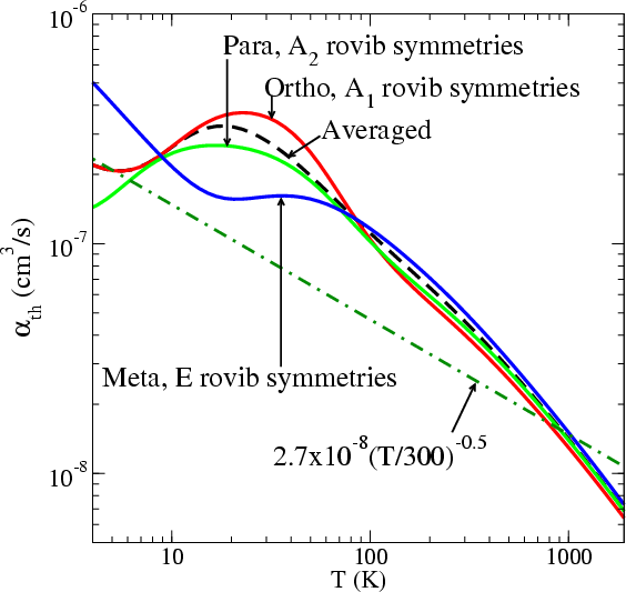 Figure B.2: Theoretical DR rate coefficients for the ortho- and para-species of H2D+, as functions of temperature. The rate coefficient averaged over the two species and the analytical expression used in earlier models are also shown. |